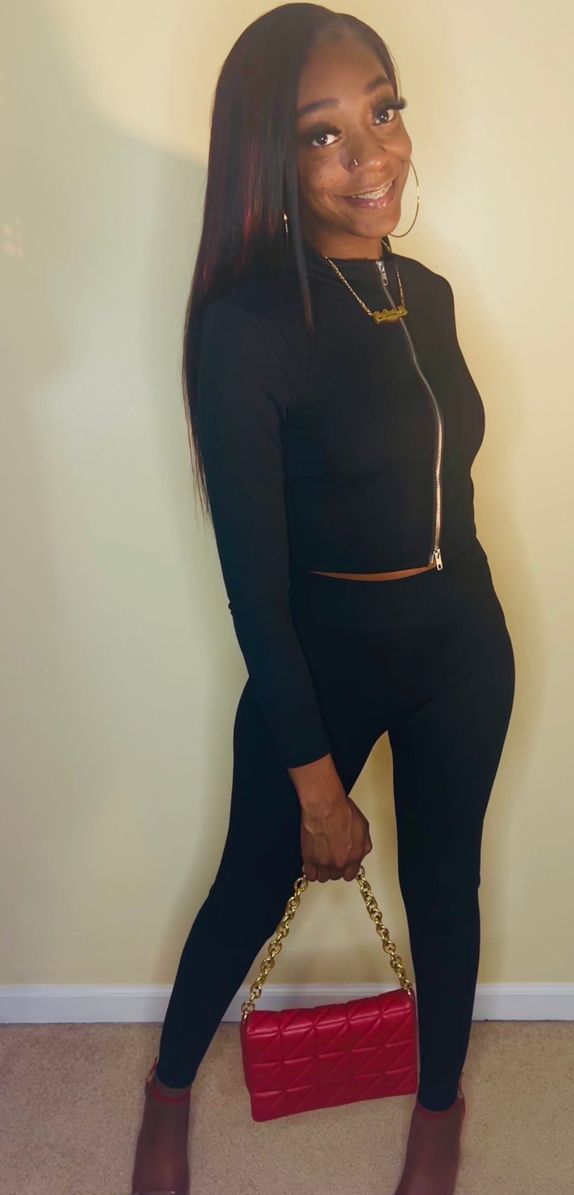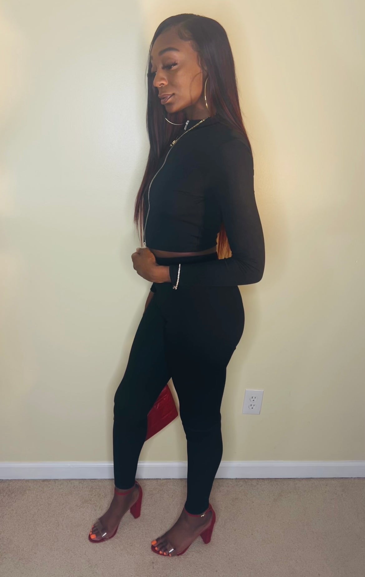COMES WITH CROP LONG SLEEVE TOP, PANTS BOTTOM. FITTED