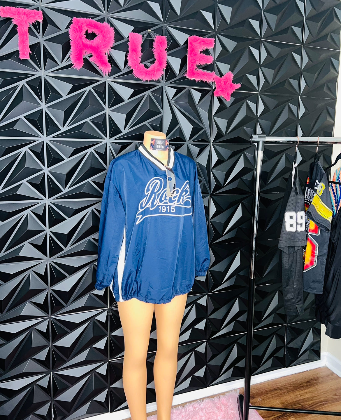 MEET OUR OVERSIZED BLUE WINDBREAKER WITH WHITE STRIPE ALONG SIDE AND DRAWSTRING ON HEM, SIDE POCKETS.CAN BE WORN AS A DRESS OR TOP. TRUE TO SIZE. "MODEL WEARING SIZE SMALL HEIGHT 5'8."